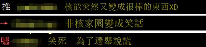 還有人諷刺稱,“核能突然又變成很棒的東西。”“非核家園變成笑話。”“笑死,為了選舉說謊。”↓