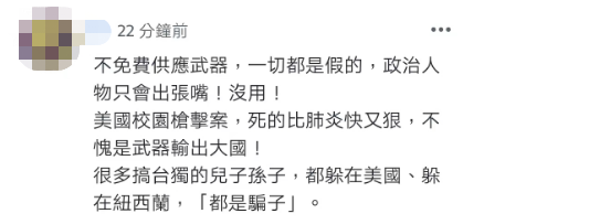 還有網友稱,“不免費供應武器,一切都是假的,政治人物只會出張嘴!沒用!美國校園槍擊案,死的比肺炎快又狠,不愧是武器輸出大國!很多搞‘台獨’的兒子孫子,都躲在美國、躲在新西蘭,‘都是騙子’。” ↓