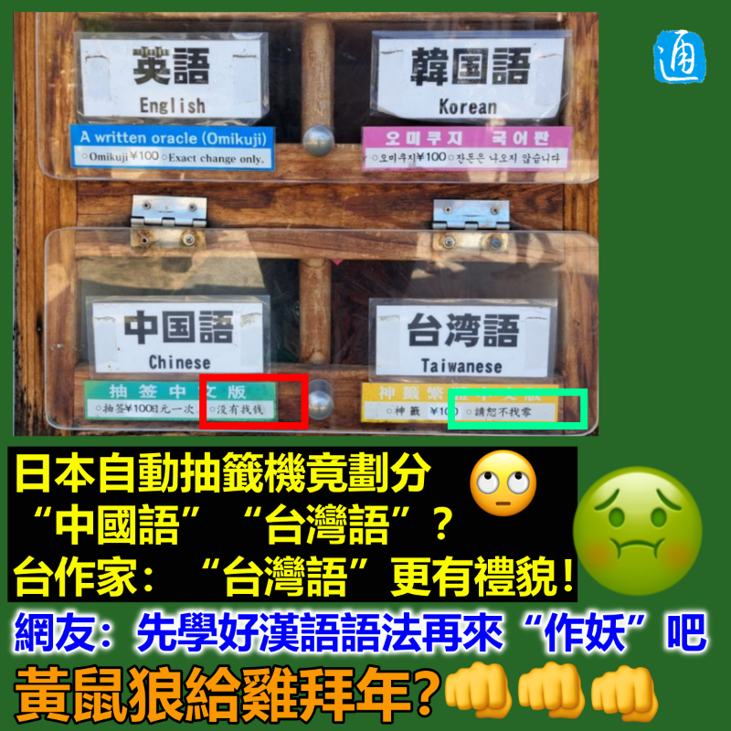圖片製作:汪彥希 據台媒報道,旅居台灣的日本作家栖來光日前在日本福岡發表日文版《日台萬華鏡》,其中提到,在參訪福岡的櫛田神社時,發現神社的自動抽籤機竟然有所謂“台灣語”,且獨立於“中國語”之外。 從照片可見,日本自動抽籤機的說明牌上竟將“中國語”與所謂“台灣語”並列。看到這,島內一些人士似乎“興奮”了! 台灣作家曹銘宗還發現,不止區分了簡體字與繁體字,連用詞和語氣都不同,稱所謂“台灣語”用詞更禮貎。 曹銘宗在社交平台臉書發文,聲稱近年來“台日的友好關係”,或許可以從日本觀光景點在中文標示上開始區分“中國語”、“台灣語”看得出來。 栖來光參訪的櫛田神社設有自動抽籤機,因為機器不找零錢,因此做出各國及地區語言牌加以說明。曹銘宗發現牌子說明也不同,在中國語一欄下,寫有 “抽籤¥100,沒有找錢”,而在所謂台灣語一欄下,寫有“神籤¥100,請恕不找零”,明顯“請恕不找零”比“沒有找錢”有禮貌。 好奇之下,曹銘宗還向在日本打拼的台灣女孩詢問了,獲回覆稱因為越來越多日本人了解“中國(大陸)”與“台灣”的不同,而日本引以為傲的款待文化是在客人提出要求之前已先準備妥當,在標示上增加所謂“台灣語”,會讓台灣民眾感覺受到尊重…… 有關作法隨即讓一些綠營及“獨派”人士嗨了起來。然而,不少台灣民眾並不買賬! 在有關消息的評論區內,有網友留言, “So what? 被(日本)殖民過,現在是黃鼠狼給雞拜年嗎?”還有網友表示,“台灣‘被’獨立了N次,但事實就是它是中國的一部分。” 不少大陸民眾看後紛紛認為部分日本景區的作法不妥,直指這是否屬 “自我感動”?並喊話“台獨”分子不要在犄角旮旯找存在感了! 【編輯:汪彥希】