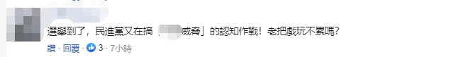 在台媒評論區,有網友留言批評稱,選舉到了,民進黨又在搞“大陸威脅”的認知作戰!老把戲玩不累嗎?↓