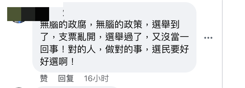 “無腦的政府,無腦的政策,選舉到了,支票亂開,選舉過了,有沒當一回事!對的人,做對的事,選民要好好選啊!”