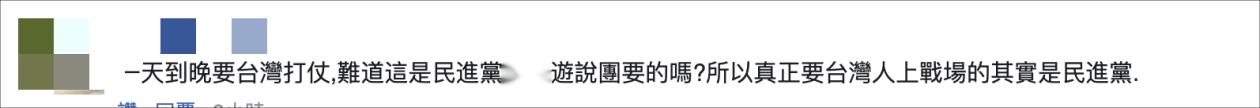 “一天到晚要台灣打仗,難道這是民進黨游說團要的嗎?所以真正要台灣人上戰場的其實是民進黨.”↓