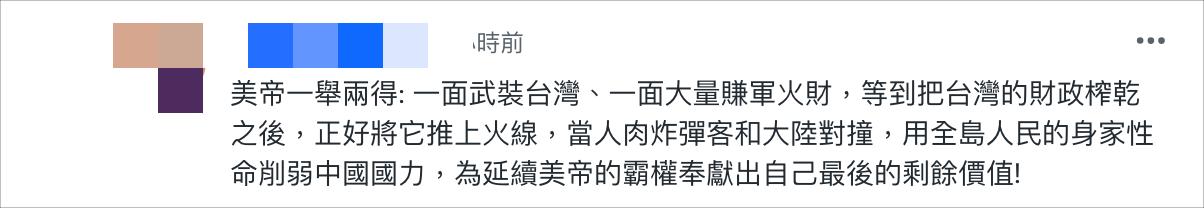 “美帝一舉兩得:一面武裝台灣、一面大量賺軍火財,等到把台灣的財政榨乾之後,正好將它推上火線,當人肉炸彈客和大陸對撞,用全島人民的身家性命削弱中國國力,為延續美帝的霸權奉獻出自己最後的剩餘價值!”↓