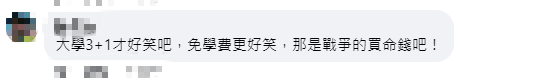有網友表示:“大學3+1才好笑吧,免學費更好笑,那是戰爭的買命錢吧!”“民進黨執政會帶領戰爭。”