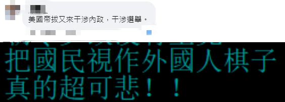 有網友質疑美國干涉島內政治,“美國在操縱這盤選舉”“美國又來干涉‘內政’,干涉選舉”,有網友指責島內政治人物受美國操控,“把民眾視為外國人棋子,真的超可悲!!”