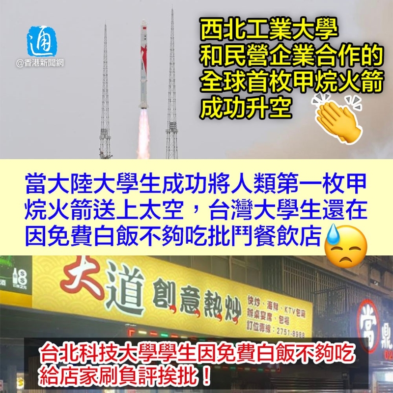 香港新聞網7月13日電 7月12日9時,由西北工業大學和民營企業藍箭航天合作研制的朱雀二號遙二運載火箭在中國酒泉衛星發射中心點火升空,隨後進入預定軌道,發射任務取得圓滿成功。這是全球首枚成功入軌的液氧甲烷火箭,標誌著中國全面掌握液氧甲烷運載火箭關鍵技術。 當西工大的學生成功將人類第一枚甲烷火箭送上太空,台灣的大學生還在因免費白飯不夠吃批鬥餐飲店。 日前,台北科技大學二十幾名學生到熱炒店用餐,由於不滿免費白飯不夠吃,直接給店家刷一星負評。熱炒店老闆痛訴遭受霸凌,宣佈將無限期暫停營業。台輿論批學生用這種手段報復店家不可取!