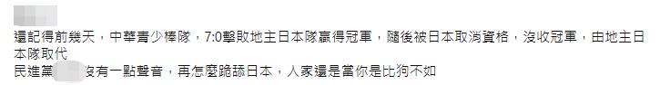 還有網友提到,前幾天,小馬亞太區青少棒球賽桃園市隊擊敗日本隊贏得冠軍,隨後被日本取消資格,沒收冠軍,由日本隊取代,民進黨當局沒有一點聲音,“再怎麼跪舔日本,人家還是當你是比狗不如”。↓