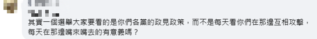 也有網友認為各黨派的政見是最關鍵的,互相攻擊沒有意義,“其實大家要看的是妳們各黨的政見政策,而不是每天看妳們在那邊互相攻擊,每天嘴來嘴去有意義嗎?”