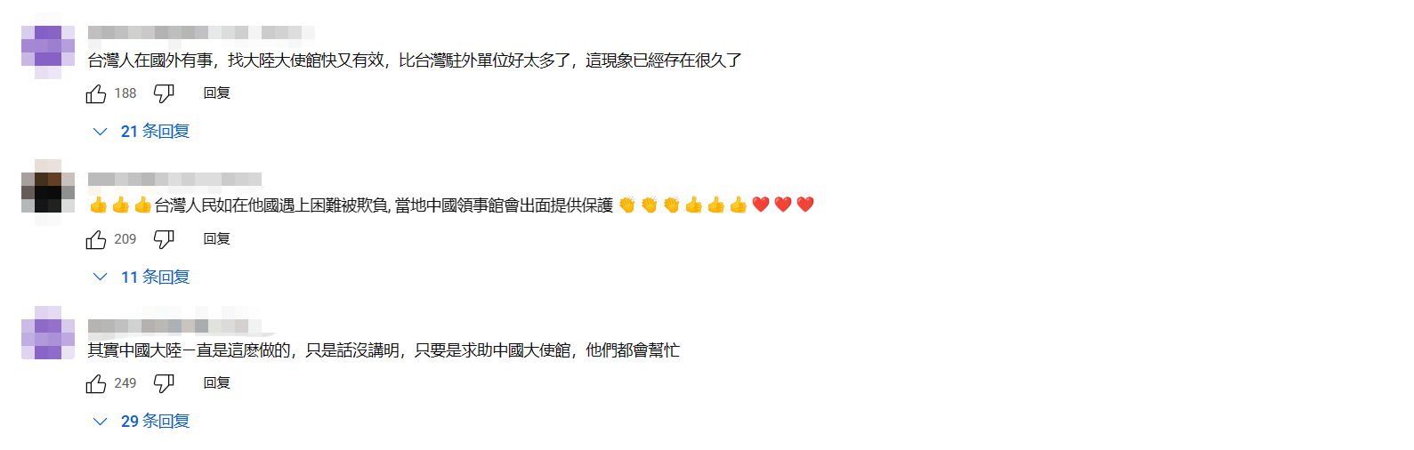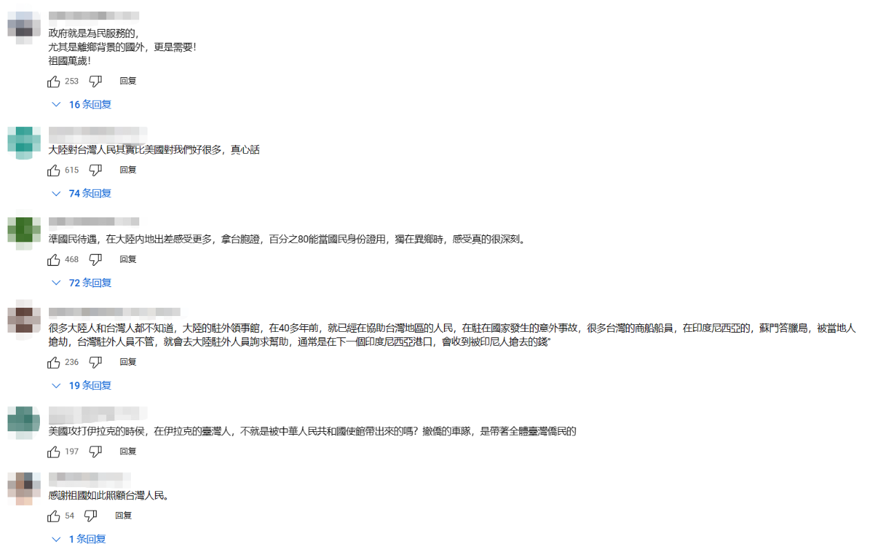 台前“立委”郭正亮。視頻截圖 郭正亮又指出,大陸制定《領事保護與協助條例》跟美國完全無關,僅出於大陸跟台灣的關係。 郭正亮提到,中國大陸邦交國很多,如果台灣民眾在海外碰到問題,大陸可以幫忙協助。他舉例指,若台灣民眾在別國被逮捕,中國大陸駐外機構可以跟該國協商;如果涉及撤僑,台灣民眾也可以求助中國領事館。 台灣教授賴岳謙亦補充,領事法雖然是國內法,但在國際之間處理糾紛、領事保護的時候,中國大陸可以藉由國內法在國際上保護台灣民眾,未來就沒有法律爭議了。賴岳謙還稱,根據維也納公約,國家之間會互相尊重,根據上述法規,假設台灣民眾在海外涉入官司或遭受不公平待遇,被當地國的法院或檢察官起訴,中國大陸的領事可以去法院旁聽,觀察有沒有濫法並可以介入,要求對方司法判決維持公正,“這對台灣民眾是很重要的法律保證。” 此視頻一出,立刻引起了廣大台灣網友的討論。 “大陸其實比美國對我們好很多。”在節目下方評論區,不少台灣網友異口同聲道出“真心話”,直言相比美國掛在嘴邊的“挺台”,大陸對台灣民眾的關照才是實實在在的,“感謝祖國如此照顧台灣人”。 也有不少網友留意到,大陸“罩”台灣的舉動確實早在相關法律推出前就有。 “台灣人在國外有事,找大陸大使館快又有效,比台灣‘駐外單位’好太多了,這現象已經存在很久了。”有網友提到,40多年前,台灣的很多商船船員在印度尼西亞的蘇門答臘島遭遇搶劫,而台灣“駐外人員”根本不管,他們便去找大陸求助,基本在下一個港口就會收到被搶去的錢。 也有網友回憶起歷史事件,指美國攻打伊拉克時,“在伊拉克的台灣人,不就是被中國(駐外)使館帶出來的嗎?撤僑的車隊,是帶著全體台灣僑民的!” 還有網友分享了自己的親身經歷,表示自己在大陸出差時更能深刻感受到這種“準國民待遇”,“拿台胞證,百分之八十能當身份證用”。