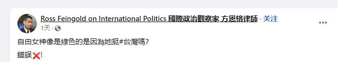 經查,這位名叫“斯坦-波蘭ê台灣囝仔”的人,是一位波蘭反華網紅,時常在網上發佈一些極端反華言論。在臉書簡介上,他說“台灣是他的第二個家”,據說此人還是一位“台灣女婿”。 百度百科中是這樣介紹自由女神像的:自由女神像,全稱自由女神像國家紀念碑,又名自由照耀世界,位於美國紐約自由島。1865年,法國政治知識分子愛德華·德·拉布拉耶建議,法國在美國建國100周年之際,贈送一尊代表自由的雕像。雕像於1876年開始建造,1886年10月23日竣工。 自由女神像重45萬磅,高46米,底座高45米,整座銅像以120噸鋼鐵為骨架,80噸銅片為外皮,30萬隻鉚釘裝配固定在支架上,總重量達225噸。自由女神穿著古希臘風格服裝,頭戴光芒四射冠冕,七道尖芒象征七大洲。右手高舉象征自由的火炬,左手捧著《獨立宣言》;腳下是打碎的手銬、腳鐐和鎖鏈,象征著掙脫暴政的約束和自由。1924年,自由女神像被指定為美國國家紀念碑。 對於這位波蘭反華網紅的“滿口胡話”,一位人在台灣名叫Ross的美國律師也看不下去了,他轉發帖子并直言:錯誤!