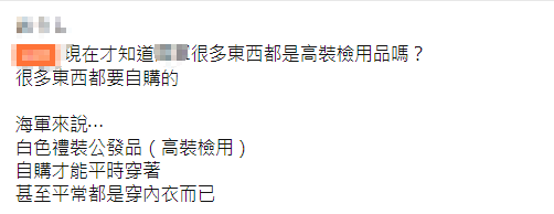 (截自吳欣岱臉書) 吳欣岱質疑,如果投資經費更新裝備只是為了應付考核,發生意外還要仰賴現場人員自學的TCCC(戰傷救護課程),且用自購的止血帶急救,“真的是有效益的投資嗎?” 這也引起台灣網友的熱烈討論。 很多人表示,並不意外有這種事情發生,在台灣當過兵的都知道,軍方下發的都是“高裝檢”用品,平時用的很多東西都要自己掏錢買:“這早就不是什麼秘密了”、“真的,長官有說”。