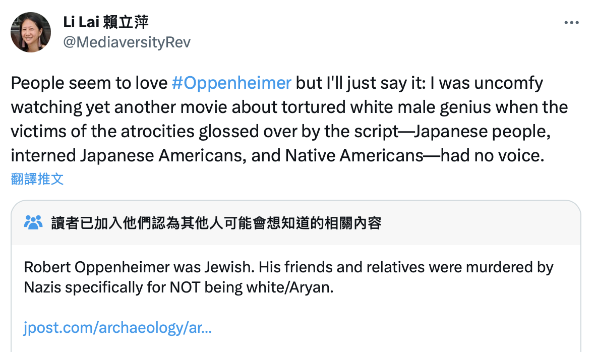 電影《奧本海默》講述了美國理論物理學家羅伯特·奧本海默參與研制原子彈的過程,台灣影評人賴立萍近日在社交平台批評該片是白人至上電影:“人們似乎很喜歡《奧本海默》這部電影,但我只能說,看這部電影時我感到不舒服。”她形容影片講的是飽受折磨的白人男性天才(white male genius)的故事,卻忽視了暴行(指原子彈爆炸)下的“受害者”——被炸死的日本人、被拘留的日裔美國人和美洲原住民的聲音。