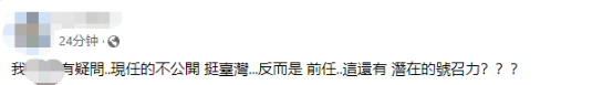 在社交平台臉書,也有網友質疑,“我有疑問,現任的不公開挺台灣,反而是前任,這還有潛在的號召力?”↓