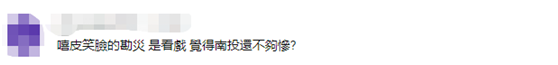 “嘻皮笑臉的勘災是看戲,覺得南投還不够慘?”有網民質疑道。↓