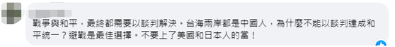 “戰爭與和平,最終都需要以談判解決。台海兩岸都是中國人,為什麼不能以談判達成和平統一?避戰是最佳選擇,不要上了美國和日本人的當!”↓