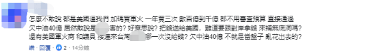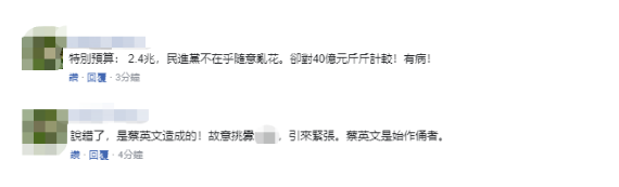 也有人批評,“特別預算:2.4萬億,民進黨不在乎隨意亂花。卻對40億元斤斤計較!有病!”“說錯了,是蔡英文造成的!故意挑釁大陸,引來緊張。蔡英文是始作俑者。”↓