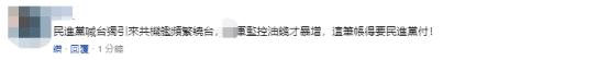 還有人認為,民進黨喊“台獨”引起解放軍機艦頻繁繞台,台軍“監控”油錢才暴增,這筆賬得要民進黨付!↓