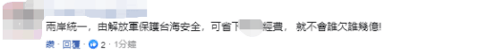 更有網民稱,“兩岸統一,由解放軍保護台海安全,可省下防務經費,就不會誰欠誰幾億!” ↓