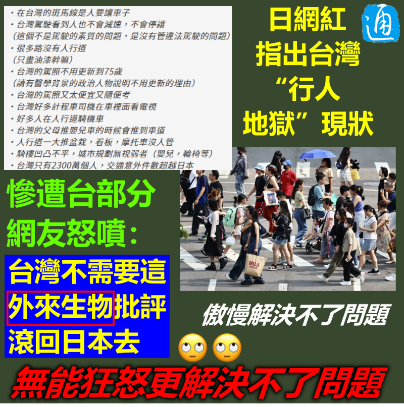 12日,Iku老師於臉書粉專發布以“受不了台灣的事情”為題的影片,表示在台灣13年最受不了的就是交通狀況,並點出台灣交通中的諸多問題,如缺乏人行道、違停現象、人行道上的障礙物、不用換駕照等。 他還質疑為何台灣僅有約2300萬人口,因交通意外離世的人卻比擁有1億2700萬人口的日本還多,認為台當局及台灣民眾太輕視交通安全,呼籲大家參與8月20日舉行的“還路於民大遊行”,以爭取更安全的交通環境。 然而,這支點出台灣現狀的影片卻引發部分台灣網友反彈,有人炮轟Iku老師過於干涉台灣事務,要他滾回日本,“來台灣多年,看不慣台灣?還募資台灣錢製造台灣動盪?滾回去”、“這是台灣非日本,輪不到日本人出嘴”、“還有辦法住13年?怎麼不滾回靜月歲好的日本,台灣不需要這外來種生物批評”。 但Iku老師沒被嚇住,昨日(16日)他再發文點出17項他認為的台灣交通問題,寫下“在台灣的斑馬線是人要讓車子、台灣駕駛看到人也不會減速,不會停讓、很多路沒有人行道、台灣的駕照又太便宜又隨便考、台灣好多計程車司機在車裡面看電視、好多人在人行道騎機車、台灣的父母推嬰兒車的時候會推到車道、城市規劃無視弱者(嬰兒,輪椅等)、台灣只有2300萬個人,交通意外件數超越日本、台灣交通意外後只會有人下跪、被國際媒體報導“行人地獄”當局還不會重視、這麼多人看,沒有一個政治人物敢出聲”等。 他還回嗆那些讓他“滾回日本”的言論,形容“我的人生目標就是改善台灣的交通問題……這樣的台灣留下來後代,你不覺得丟臉嗎?” 事實上,早在2018年,就有日本媒體人注意到台灣的交通事故死亡率竟是日本的4.4倍,更哀歎“台灣駕駛太傲慢,將馬路當專屬汽車空間,都不禮讓行人。”並表示,唯有駕駛人謙卑,才能減少交通事故。 據悉,為呼應民眾期待解決“行人地獄”的問題,中國國民黨今日表示,青年團及青年部將參與8月20日舉行的 “還路於民”大遊行,屆時約有50多名青年朋友共襄盛舉;台灣地區領導人選舉參選人侯友宜承諾,會努力實踐人本交通環境,回應民間團體的5大訴求,終結“行人地獄”惡名。 台灣“車子就是獅子”的現象能改變嗎?真的能“還路於民”嗎?還需拭目以待! 【編輯:汪彥希】