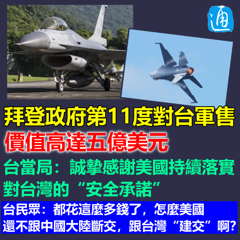 汪彥希製圖 據台媒報道,美國國防安全合作局(DSCA)23日宣布,美國國務院批準售台F—16紅外線搜索追蹤系統(IRST),金額約5億美元。這也是美國總統拜登上任後對台的第11度軍售。美國防安全合作局聲稱,這項軍售將強化台灣捍衛空域、提供區域安全,也增強與美國在F—16計劃的軍事互操作性,有助於提升台灣應對當前與未來威脅的能力。 對此,蔡英文辦公室發言人林聿禪聲稱,當局感謝美國依照所謂的“與台灣關係法”及“六項保證”,向台灣地區提供“防禦性”武器,持續落實對台灣的所謂“安全承諾”。 林聿禪還宣稱,台灣將深化台美緊密的安全夥伴關係,並持續與理念相近的國家及地區合作,共同維護台海及印太區域的“和平穩定”與“繁榮發展”。 台外事部門亦對美方軍售表示高度歡迎,稱美國持續實踐近年來對台軍售常態化的政策,展現美國政府對台灣防衛需求的高度重視,協助台灣即時獲取防衛所需裝備,提升台灣防衛戰力與嚇阻能力。 據了解,美國參議院於2022就通過對台灣五年百億美元的“無償軍援”,但似乎“無償”沒有做到,“軍售”倒是做得明明白白。 不過,台政客沾沾自喜“感恩美國”之際,台灣民眾坐不住了。 有網友在台政客感謝美國軍售的新聞下留言嘲諷,“都花這麼多錢了,怎麼美國還不跟中國大陸斷交,跟台灣‘邦交’啊?”也有網友直指,“別浪費錢了,好好跟對岸相處,把錢發給人民不是更好。開戰,高官又不用上戰場……” 還有網友“好奇”,拜登已經第11次對台軍售了,之前買的武器交齊了嗎? 【編輯:汪彥希】