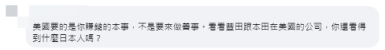 還有網民評論稱,“美國要的是你賺錢的本事,不是要來做善事。看看豐田跟本田在美國的公司,你還看得到什麼日本人嗎?”