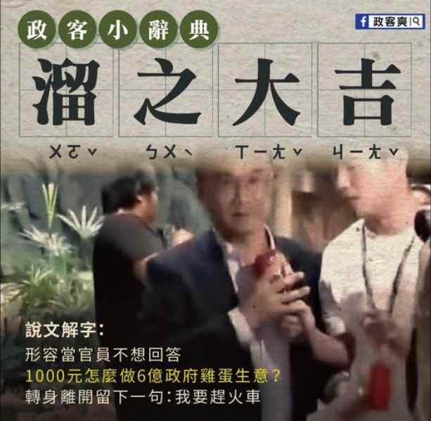 (圖源:臉書粉專“政客爽”) “溜之大吉!”對此,臉書粉專“政客爽”製作一張“說文解字”圖文,諷刺陳吉仲:“形容當官員不想回答1000元怎麼做6億政府雞蛋生意?轉身離開留下一句:我要趕火車。”“政客爽”說,不要問,問就是趕行程;如果記者跑來問,那就用力把麥推走! 台灣PTT網友也紛紛留言諷刺,“這就是台灣高水準的官員”、“上三立被問到落跑是怎樣”、“在自家電視台被問到落跑,笑死”。 雖然陳吉仲公開了與“超思”合約,但仍未平息外界質疑。中國國民黨台北市議員張斯綱就指出,合約上白紙黑字寫著,“超思”只要拿到報價單就可以向台灣當局請款,无须代垫款项,白赚8%服务手续费, 認為陳吉仲“不是合約造假,就是記者會說謊”,陳吉仲簽的合約,狠狠打臉陳吉仲開的記者會。 【編輯:石欢欢】