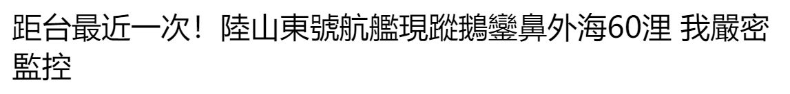 (台灣“中時新聞網”圖片) “距台最近一次!陸山東號航艦現蹤鵝鑾鼻外海60浬,我嚴密監控”,台灣“中時新聞網”9月11日以此為題報道稱,台灣防務部門表示,發現解放軍山東艦航母編隊位於台灣鵝鑾鼻東南60海里,向東航行進入西太平洋航訓。鵝鑾鼻位於台灣本島最南端。 另外,台灣防務部門稱,今日(9月11日)清晨5時40分起,陸續偵獲解放軍殲-16、蘇-30、空警-500及無人機等各型機計13架次出海活動,其中11架次逾越所謂“中線”延伸線進入西南空域。這也是解放軍軍機连续兩天早上,11架次軍機越過所謂“台海中線”。 台軍此前長期關注解放軍航母編隊動向。2023年4月24日,台灣防務部門曾發出新聞稿表示,解放軍山東艦航母編隊在西太平洋航訓,距離鵝鑾鼻東南方120海里,並公佈一張從空中俯瞰拍攝的照片。