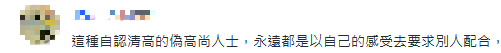 “這種自認清高的偽高尚人士,永遠都是以自己的感受去要求別人配合。”
