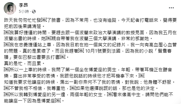 李昂後續回應。臉書截圖 李昂隨後表示,在捷運上讓座與否,只要有理由或者態度和善,她都選擇尊重,但那個對她藐視、翻白眼的女生才是真正觸怒了她,所以她才發了早先那篇貼文。 至於為什麽要喊話蔣萬安,李昂認為隨著台灣人口老齡化越來越嚴重,這樣的糾紛只會越來越多,那麽是不是可以有一個更明確的規範讓大家都去遵守?畢竟這是博愛座而不是一般的座位。 其實,台灣博愛座的“禮讓”與“逼讓”爭議早已有之,2016年台灣“衛福部”就表示,有民眾提議將“博愛座”改稱“優先座”;也有民眾提議,幹脆直接廢除博愛座,這樣就可以避免再發生爭議,這一觀點當時甚至得到不少民眾的認同。但後面由於各種原因,博愛座被保留了下來。 據了解,台灣女作家李昂本名施淑端,出生於台灣彰化鹿港,李昂是其筆名,其作品中最為顯著的元素是女性主義,著有《殺夫》等小說,2004年曾獲法國“藝術與文學勛章”。(完) 【編輯:凌玉辉】