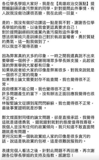 賴清德10月3日在台灣中山大學演講。(翻攝台灣中山大學學生會臉書) 據台媒報道,賴清德日前(10月3日)在台灣中山大學演講,並接受學生“開放式”提問。一名女大學生質疑“民進黨執政後不斷爆出疑似貪污弊案”,問賴清德有什麼解決辦法。此問題獲得在場學生鼓掌叫好。 沒想到,賴清德卻反問女學生:“哪一個具體事件,讓你有這樣的想法?”、“印象最深是哪一案?” 女學生答不出來,隨即求助全場學生,現場此起彼伏“疫苗採購”、“台南光電案”、“進口雞蛋”、“新竹棒球場案”! 對此,賴清德全都沒有回應,而是辯稱,這些案子已經進入司法程序,然後還教育學生“在評論案件前,多花點心思思辨,仔細關注有沒有具體事證”。接著更轉移話題,講起民進黨的創黨歷史…… 隨後,賴清德的相關言論在網絡引發兩極化反應。 有網友認為女學生“沒有一刀斃命的證據”,也有網友指出,民進黨的弊案“隨便一堆”,“罄竹難書,當然講不出來”,嘲諷賴清德“只會反質詢”。還有更多網友则大讚女學生“好勇敢”、“問得好!” 事後,該女學生在學校臉書粉專發文,承認自己提問沒做好功課,但她做到了勇於質疑執政者,所以並不覺得丟臉。 這位女學生也強調,如果執政者給大家的印象是弊案很多,這就是一個很不正常現象,“不敢面對問題就是有問題”。