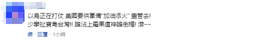 “以(以色列)烏(烏克蘭)正在打仗,美國要供軍備‘加油添火’儘管去!少攀扯寶島台灣!誰沾上霉果(美國)瘟神誰倒霉!滾。”