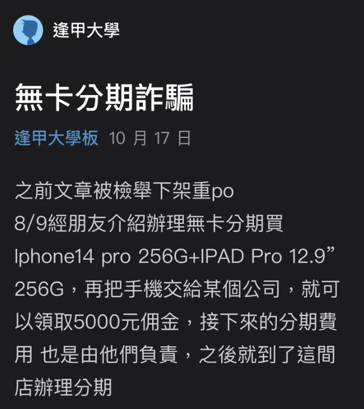 10月中旬有台灣網友在島內論壇發文稱遭到無卡分期詐騙。(圖片截自Dcard) 島內詐騙集團為何盯上大學生?受害學生認為,大學生無卡貸款核款容易,“乾淨沒有案底”,而且出事也怕被家長罵,“很多學生自認倒楣,默默多打份工吞了”。 其實,很多大學生驚覺被騙後,也曾一度討要說法。林男卻稱“現在資金困難,沒辦法幫忙繳”,至於簽約的手機店,更是火速撇清關系,指林男並非公司員工,只是常客。 但詭異的是,據台媒報道,與走訪記者對話的手機店員工,學生認出其實就是老板本人。 對此,台灣民眾紛紛怒斥:“連學生都騙,真夭壽!”、“台灣反詐騙團隊呢?”有人則指出,這是經典騙術,不要貪就不會受騙。 【學校急發信提醒,警方鎖定嫌犯追查】 諸多大學生遭詐事件經台媒曝光後,台灣逢甲大學今天(10月27日)證實,已有近百名學生受害,10月12日接到第1個學生通報,10月13日立即發信通知全校學生,呼籲“不要再受騙上當”,“天下沒有白吃的午餐”。 逢甲大學表示,此案已進入專案調查,學校也充分和警方配合,雖抓到1名犯嫌,背後的集團和組織仍在追查中。 台灣東海大學也表示,有1名學生受害,並已提供相關法律諮詢。學校將持續掌握其他受害者身份,對受害學生予以追蹤關懷及輔導處遇。 台中市警局第六分局表示,近日陸續接獲轄內兩家大學、共8位學生報案,目前已掌握嫌犯身份,並報請檢方指揮偵辦,也將清查是否有其他被害人。 台灣警方提醒,輕鬆就能賺取財物,很可能是詐騙手法,務必謹慎小心求證,避免受害。 【起底無卡分期騙術】 據了解,上述詐騙案中提到的所謂“無卡分期”,又稱“免卡分期”,是一種不需要信用卡也可以分期購買商品的方式,這讓沒有信用卡或額度不足的消費者,既能提前買到心儀商品,還能減輕付款壓力。 簡單來說,就是過去的“賒銷”。 不過,值得注意的是,“無卡分期”不是現金借貸,也非信用卡分期,在還款結束前,商品的所有權仍在賣家手上,若消費者未能及時還款並存在消費糾紛,有可能被要求支付一定利息,甚至被惡意討債。 如何識別騙子話術?台媒指出,只要看到以下說法,就是詐騙無誤: “會幫忙代繳每月分期款”,實則藉名購買商品。 “未滿20歲不會通知家長”,但依台灣法規定,未成年者需有法定代理人同意(註:台灣民法已下調成年年齡為18歲)。 “簽免責條款,不需繳納無卡分期費用”,事實上此舉不具法律效力,民眾簽訂契約仍須注意內容。(完) 【編輯:石欢欢】