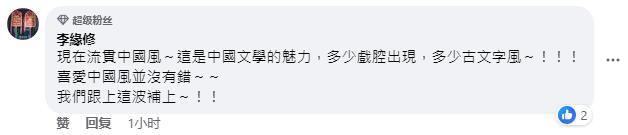 還有網友表示相當“欣賞”:“現在流行中國風,這是中國文學的魅力,多少戲腔出現,多少古文字風,喜歡中國風并沒有錯,我們跟上這波補上!!”