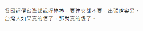 有台灣網友表示,各國評價台灣都說好棒棒,結果都不想要“建交”,“台灣人如果真的信了,那就真的傻了”。
