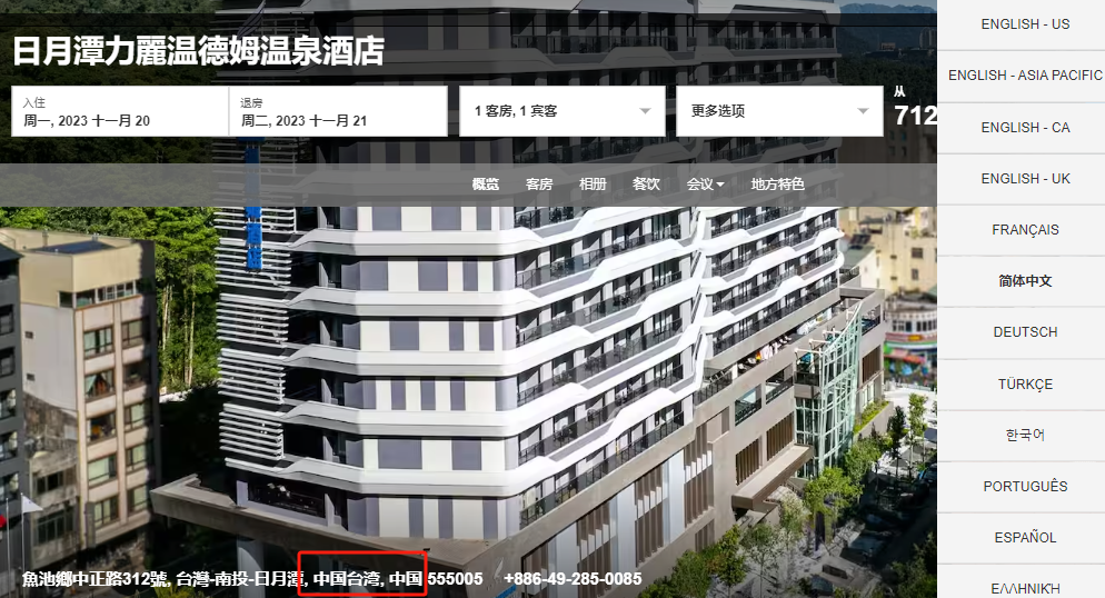 日月潭溫泉酒店官網截圖 台灣“三立新聞網”報道稱,台灣民眾準備到日月潭游玩,先上網搜索飯店相關資訊,其中力麗溫德姆溫泉酒店8月開始試運營,明年1月正式開業。有民眾發現,從酒店訂房系統點進去,僅提供簡體中文等12種語言,沒有繁體中文,且飯店地址有“中國台灣”字樣。 日月潭力麗溫德姆溫泉酒店在網頁上介紹,該酒店為力麗集團投資興建的國際品牌酒店,由世界知名的酒店管理集團——美國溫德姆集團(管理)特許經營。 針對台媒的報道,業者回應稱,飯店百分百是台灣人投資興建,為吸引更多島內外游客,所以加入溫德姆集團,訂房會再轉連接到溫德姆訂房網。由於該集團亞太地區由中國大陸負責,地址才會出現“中國台灣”。業者稱,合約已經簽署,到期前須受集團管理,雖無法自行更改但一定會向上反映。 另據島內綠媒《自由時報》,南投縣政府觀光處稱,日月潭力麗溫德姆溫泉酒店是觀光飯店,屬於台“觀光署”管轄。“觀光署”表示,已通知該飯店改善。 對於綠媒和一些人的炒作,一些台灣網友的態度是“拒絕消費”和“抵制”,并在臉書評論區留言寫道:“預定的可以退房了”;“拒絕去消費”。 但也有人諷刺:“玻璃心碎一地。”↓