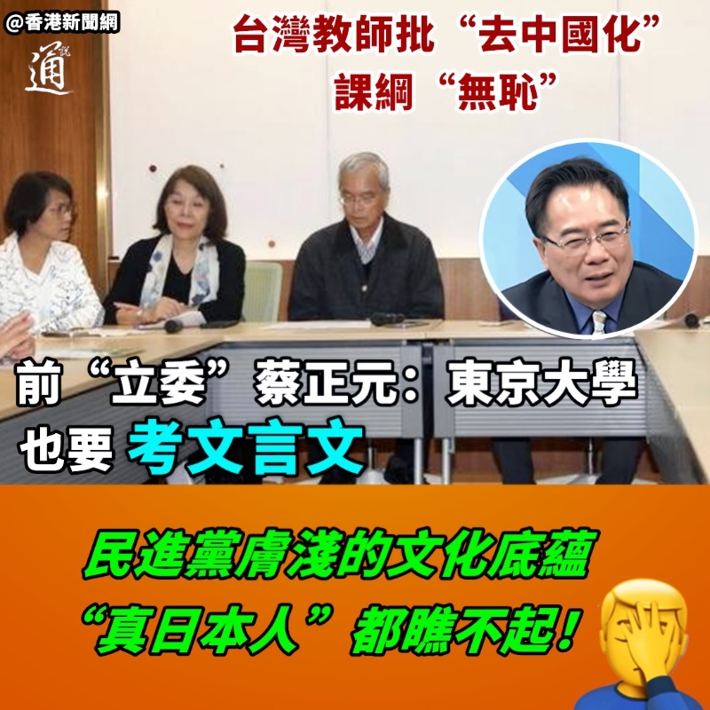香港新聞網12月12日電 台灣台北市第一女子高級中學的語文老師區桂芝日前因不滿台教育事務主管部門公布的新課綱大量刪減文言文課文,痛批“無恥、缺德”。對此,台前“立委”蔡正元昨日(11日)發文,直指日本最好的大學東京大學的入學考試也要考文言文,反觀民進黨和“台獨”分子,為“去中國化”,大幅限縮高中課綱的文言文教學,“他們膚淺的文化底蘊只會讓‘真日本人’瞧不起。” 蔡正元昨日在社交平台臉書以“東京大學考文言文”為題發文,指以2022年為例,日本語文科考試共有4題,當中第二題考濱松中納言物語的典故,這個典故就跟唐朝有關,第三題則直接考文言文經典,《呂氏春秋》的《用民》篇。