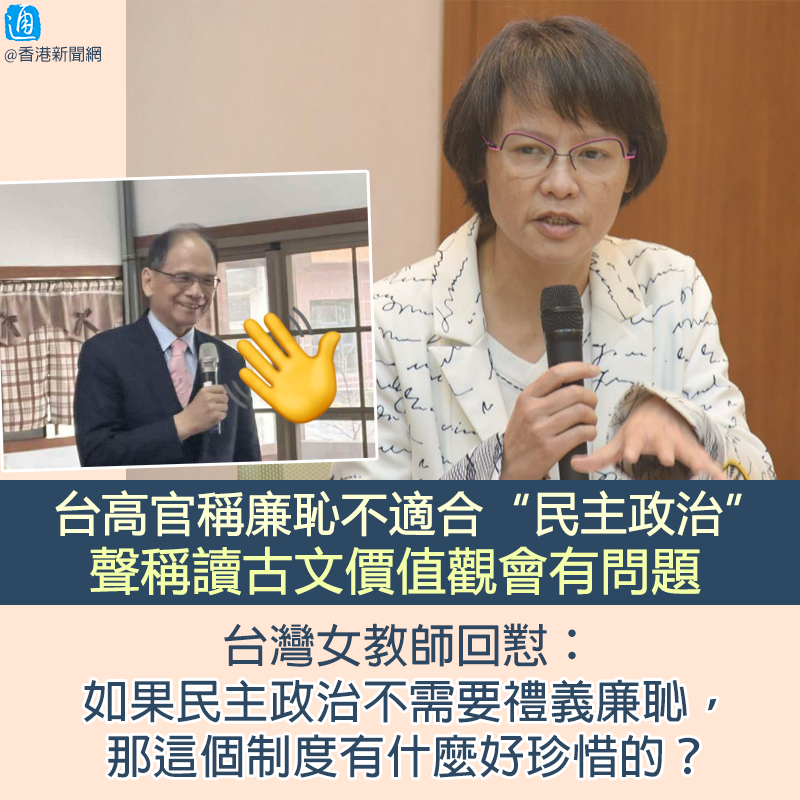 台高官稱廉恥不適合“民主政治” 女教師回懟:西方不需要禮義廉恥?分享到: