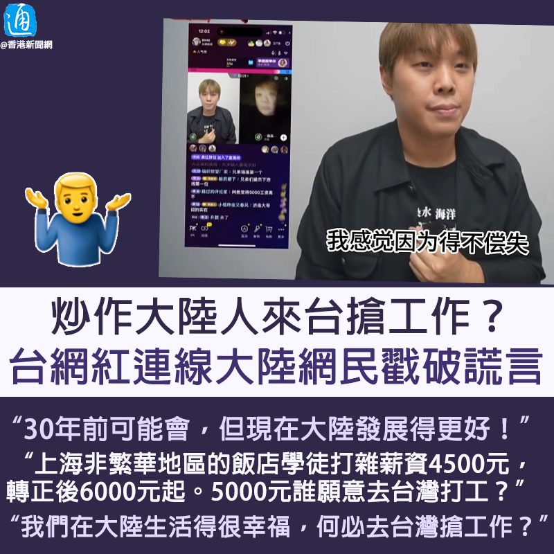 炒作大陸人來台搶工作?台網紅連線大陸網民戳破謊言分享到: