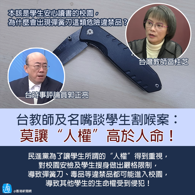 香港新聞網1月2日電 台灣校園日前發生恐怖割喉案,引發社會對校園安全問題的擔憂。對此,台時事評論員及教師紛紛發聲,批評台當局修訂的“教育法”淪為“惡人”的保護傘! 2023年12月25日中午,新北市一中學三年級女生與同學發生口角,於是找自己班上的“乾哥哥”幫她出頭。“乾哥哥”找到對方後竟拿彈簧刀刺向其頸部和胸口,後者身中多刀當場倒地,雖即刻送醫搶救,仍於26日晚宣告不治身亡。 悲劇事件引發台灣社會不安與憤怒,也讓人疑惑,本該是學生安心讀書的校園,為什麼會出現彈簧刀這類危險違禁品?學校為何沒有搜查違禁品? 原來,2022年,台灣教育部門修正“學校訂定教師輔導與管教辦法注意事項”,規定學校必須有相當理由及證據認為學生有帶違禁品才可開始搜查,並要求搜查時有學生或家長代表陪同。 台時事評論員郭正亮在節目中批評,這樣的規定看似捍衛了學生的權利,卻忽略了校園安全和秩序。他指出,民進黨為了讓學生所謂的“身體自主權”和“人格發展權”得到重視,規定學校不能干預學生行為,導致彈簧刀、毒品等違禁品都可能進入校園,而這將導致其他學生的生命權受到侵犯。