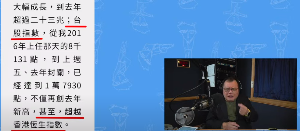 (廣播節目《飛碟晚餐 陳揮文時間》視頻截圖) 他指,查詢新加坡的海峽時報指數,發現他們當日收盤3000多點,“我們台股多少點,1萬7千多,如果你要比大盤指數,我們早就贏新加坡了。”又補充稱,若比大盤指數,台灣都“贏”韓國了。 陳揮文坦言,台灣各項經濟指標不如香港。談及全球金融中心,外界也首推紐約、倫敦,接下來就是香港,不會有人講台北。他強調香港股市的總市值比台股高,但這是蔡英文及2024台灣大選民進黨參選人賴清德不會說的。“民進黨很會選舉,民進黨很會騙,重點是很多人被民進黨騙還不知道。”