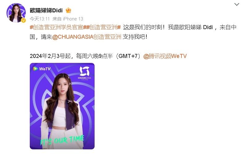 微博截圖 據媒體報道,《創造營2024》即將開播的消息一公佈,就引起了網友們的高度關注,歐陽娣娣以英文名“DIDI”參加節目,台媒描述稱,在形象照中歐陽娣娣一頭飄逸的波浪長髮并搭配蝴蝶結辮子,甜美又可愛。她在配文以中英文雙語的方式寫道:“這是我們的時刻!我是歐陽娣娣,來自中國,請來支持我吧!” 據悉,歐陽娣娣目前就讀北京電影學院,出生在台灣的她,將與來自中國大陸、日本、韓國、美國、泰國、馬來西亞、新加坡、越南、印尼、印度的參賽者競爭。 隨後,歐陽娣娣的姐姐歐陽娜娜也在社交平台上轉發該帖文為妹妹打氣。