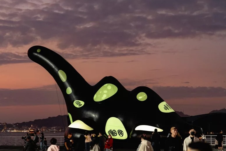 大型充氣藝術裝置展“療癒森林”高雄港17號碼頭登場。(圖片:高雄市文化局) 高美館代理館長林羿妏表示,“充氣”作為一種裝置藝術形式給了藝術家創作新的可能,此次展出中高達12米的黑色大恐龍《傷口裡的光-Please蛇頸龍》,來自藝術家陳普的“黑青”系列作品,“黑青”生物以不同的尺寸與載體穿梭在平面與立體、真實與虛擬之間,有獨特的藝術生態系,布著傷痕的蛇頸龍傳達出人們成長過程不斷受外在刺激而蛻變茁壯的生命歷程。