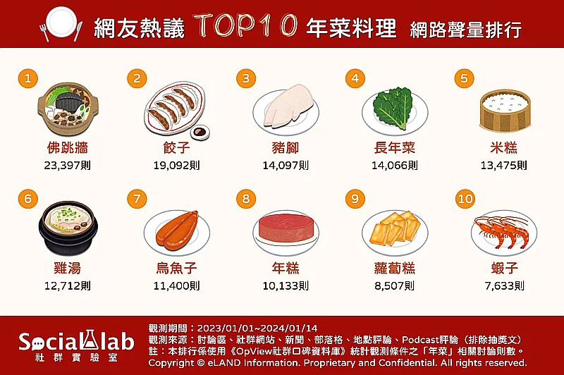 民眾熱議台灣十大年菜料理。 (圖源:Social Lab社群實驗室) 而餃子也是被眾多網友認定為不可或缺的年菜之一。這個外型酷似“元寶”的料理,有著招財進寶的美好寓意,因此每逢年節,便會端出香噴噴的水餃,寄予著滿滿的喜氣和祝福。在談到過年怎麼吃餃子時,許多網友紛紛分享自己的吃法,像是“餃子包銀幣,叫做‘元寶’”。若吃到有硬幣的餃子,便象徵著該人在新的一年中,有可能會有著財源滾滾的好運。 另外,在新的一年享用豬腳也是許多家庭的習慣之一。台灣有俗語叫“吃豬腳添福壽、吃腿庫補財庫”,在過年這樣充滿喜氣的日子里,與家人一同品嚐美味的豬腳,就象徵著未來一年將財政充盈,不僅守住錢包,也讓整個家庭在新的一年中都能繁榮昌盛、財源廣進,好吃又充滿吉利寓意的豬腳,讓網友紛紛表示根本是“開運必吃”。 除此之外,米糕、雞湯、烏魚子、年糕、蘿蔔糕等耳熟能詳的且一些具有“台灣特色”的菜餚同樣榜上有名。雖然多了不少民眾外出到餐廳用餐或直接訂購年菜,仍有不少家庭會選擇自己做團圓飯,雖然備料與善後的過程相對繁瑣,但正因為從頭到尾都是由自己把關,不僅在衛生方面更為安心,還能控制油鹽的用量,守護家人的健康。(完) 【編輯:施鑫岳】