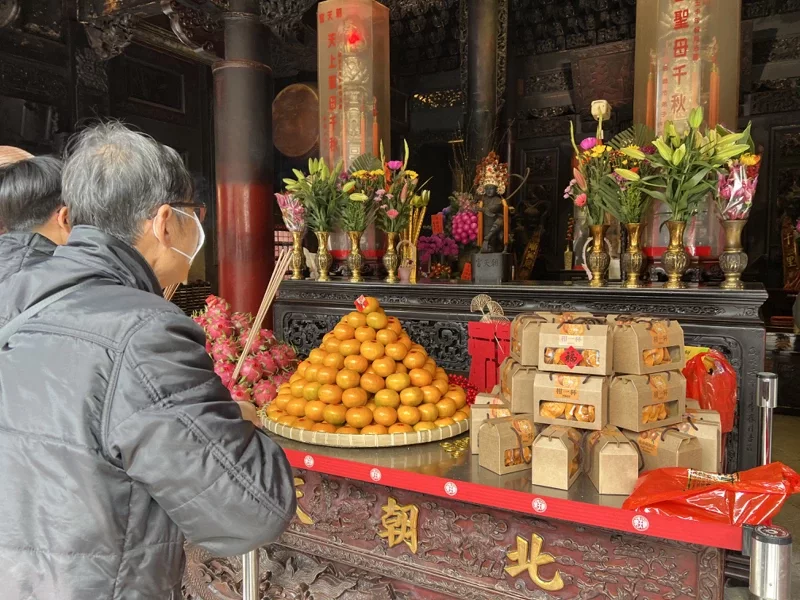 除夕夜,家家戶戶燈火通明,喜慶的紅色映襯出滿滿的年味。相傳在遠古時期,有一隻凶殘的年獸,每到歲末就會到村里作祟。年獸害怕紅色和火光,因此大家便會在家門口貼紅紙、燃燒爆竹,希望藉此驅趕年獸。除夕這一天,長輩還要準備一些“壓歲錢”發給小孩和晚輩,壓歲錢的用意是壓住邪祟,“歲”與“祟”諧音,意思為領到壓歲錢就可以平平安安度過一年。而年夜飯同樣講究,吃魚代表“年年有餘”,菜頭粿(蘿蔔糕)寓意“好彩頭”,年糕象徵“年年高陞”,長年菜整根從頭吃到尾表示“延年益壽”,餃子則因外觀似“元寶”,有財源滾滾之意。 大年初一不賴床,“走春”“拜拜”迎好年