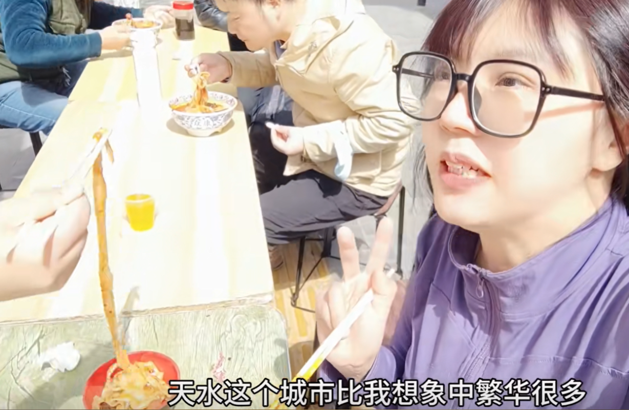 視頻截圖 陳方雨大力推薦甘肅美食,認為這裡的羊肉是在南方城市或者台灣都沒有吃過的味道。她表示許多台灣人認為甘肅只有駱駝和沙漠,但事實上這裡有很多讓人意想不到的美景和美食,她呼籲台灣年輕人親自來體驗。 台灣女生劉樂妍前往天水品嘗麻辣燙時,則被當地人的熱情所打動。她表示,一出高鐵站就有免費專列將遊客送往麻辣燙打卡地點,亦有社會各界熱心人士願意免費搭載遊客。 “天水美食不是只有麻辣燙,好吃的還有漿水打滷麵!”在天水的最後一餐,劉樂妍還遇到當地食客大力推薦天水特色美食。 劉樂妍感歎,這個城市比自己想象中繁華很多,高樓大廈遍地都是,當地人也很熱情。