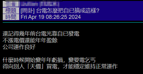 (圖片截自台灣論壇PTT) 在台灣論壇上,亦有島內網友發文感嘆,前幾年台電光靠“自己發電”,不漲電價還能年年盈餘,現在卻年年虧損,變成“要電乞丐”,還得向外“天價”買電才能維持正常運作,“台電怎麽把自己搞成這樣?” 針對外界質疑,台電今天作出回應,表示並非每度電都買12元,平均每度5-6元,4月15日共向半導體、電子、石化、鋼鐵大廠共10多家購電,總計約2400萬。至於全年會花多少,暫時沒有答案。 有台媒評論,“需量競價”行之有年,國際上常用這套制度調度電力,只是4月台灣才剛漲電價,夏季用電高峰期還沒到,各地卻不斷跳電、停電,台電緊急應變成本又高得嚇人,難免讓民眾擔心是否會有供電危機。(完) 【編輯:石欢欢】