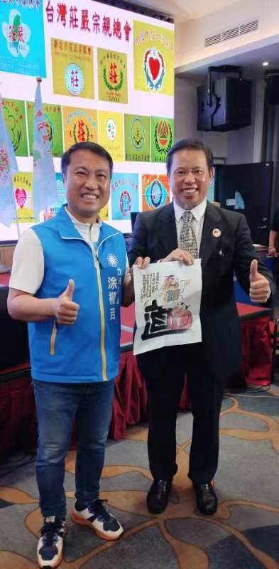 涂權吉(左)、莊偉祥 大會同時邀請了三位重要主禮嘉賓,分別為邱奕勝、張善政及中國國民黨立委涂權吉,香港莊子文化研究會會長莊偉祥在大會中向三位主禮嘉賓贈送吳元老師創作的莊子名句漫畫。 “《莊子》古學今用”講座在現場數百位出席人士見證下正式展開,100幅的講座內容,包括6則莊子寓言故事及二十多幅莊子名句漫畫,在近一小時的演講下分兩節順利進行。(完) 【編輯:鄭竣凱】