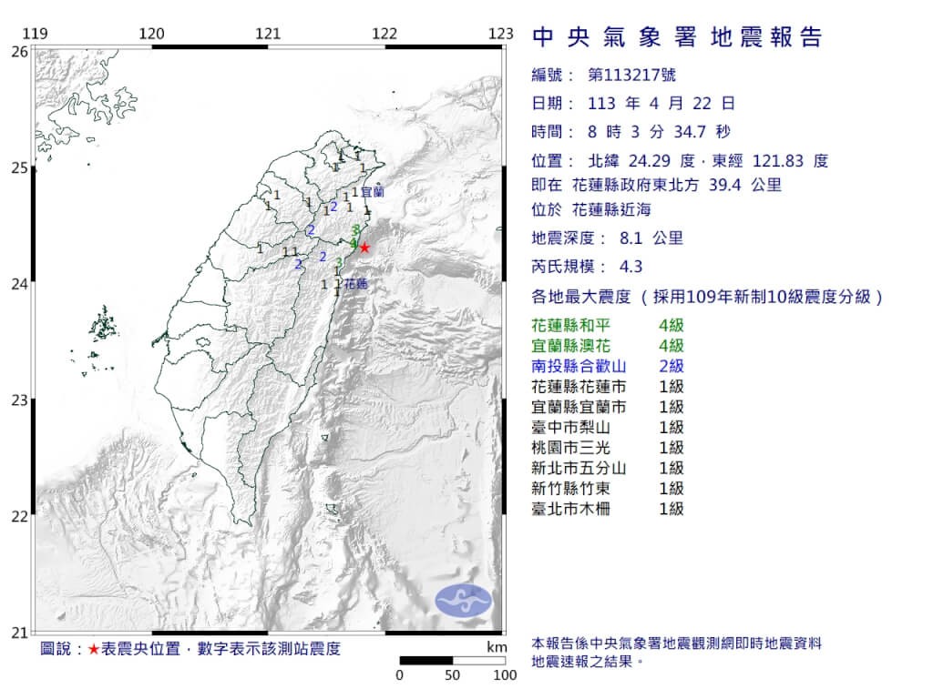 台灣氣象部門:花蓮近海發生4.3級地震 最大震度4級
