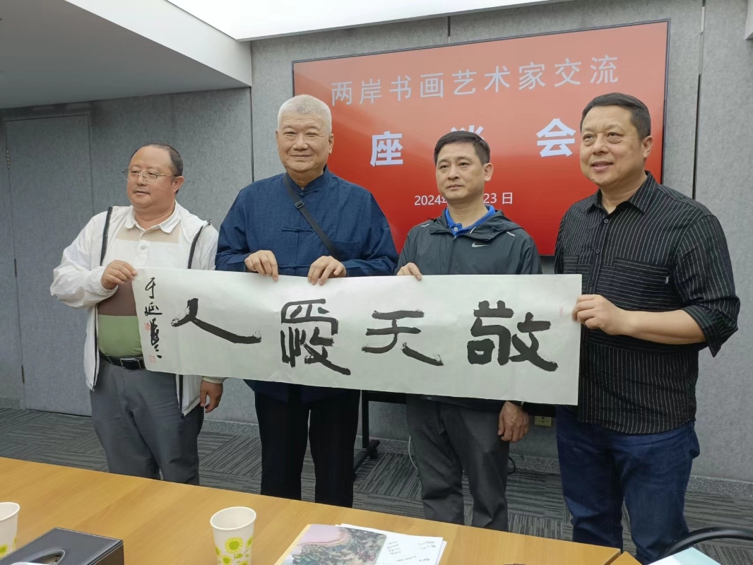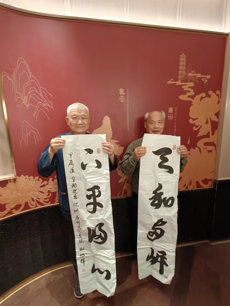 謝明輝(左)贈送書法作品給深圳台辦 (謝明輝提供) (三)前往何香凝美術館參訪。參訪何香凝書畫作品及一生對國家的貢獻。 (四)前往海峽兩岸交流基地中山公園棒球場 (五)南山天后博物館參訪 (六)前往大芬油畫村參訪 大芬村藝術產值年達38億人民幣,形成完整產業鍊,深值台灣借鏡。 天和兩岸,下平歸心,謝明理事長完成詩詞創作。 王大平、林錢旺、詹德源等書法大師寫成作品,贈送給台辦典藏。(完) 【編輯:施鑫岳】