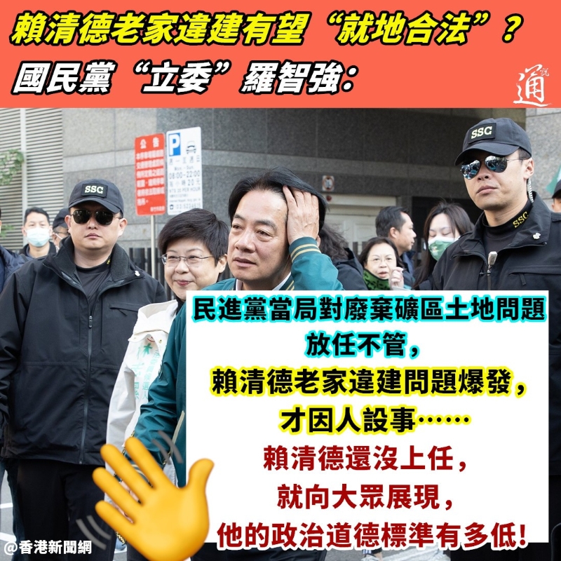 香港新聞網4月30日電 “賴皮寮”違建要賴掉了?民進黨主席賴清德將於5月20日就任台灣地區領導人,但其位於新北市萬里區的老家此前爆出違建爭議。國民黨新北市議員江怡臻近日提到,台當局“國土署”擬以“北泰雅原住民族特定區域計劃”處理廢礦區土地問題,2017年5月16日前的建築可由地方政府主動變更編定為建築用地。她質疑此舉是要替賴清德老家解套,讓其就地合法。對此,國民黨“立委”羅智強今日(30日)發文痛批,賴清德還沒上任,種種舉動就向台灣民眾展現,“他的政治道德標準有多低”。